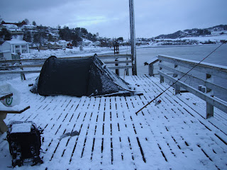 Driiit vær av de grader har det jo vært i hele helga og det vil si at det har snødd vannrett og så tett at jeg ikke engang så stangtuppen viss jeg holdt stanga!!!! Og blåste såppas at jeg var redd for at taua til telte skulle ryke så gravde nesten ned telte for at vinden ikke skulle få så godt tak i det! men fisk blei det! Ikke i nærheten av forje hælj men 4 hvitting 1 lyr 1 sei og 9 flyndrer er greit syns jeg. Gidder ikke å skrive så mye denne gangen men da får dere heller kose dere med bildene av den lille stunda det gikk å ta fram kamra og ta bilder!